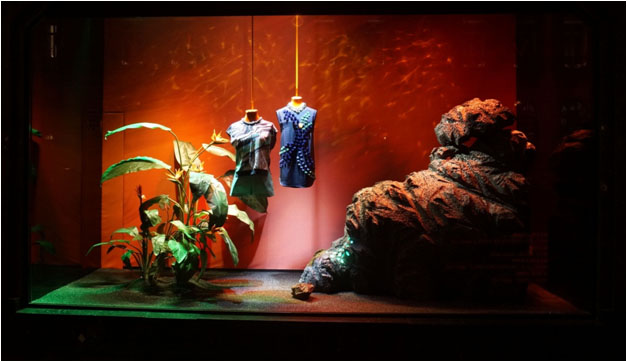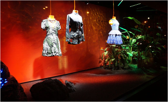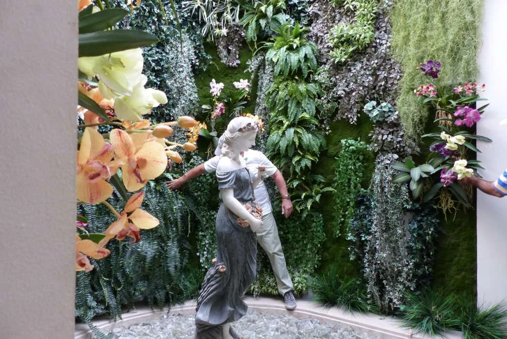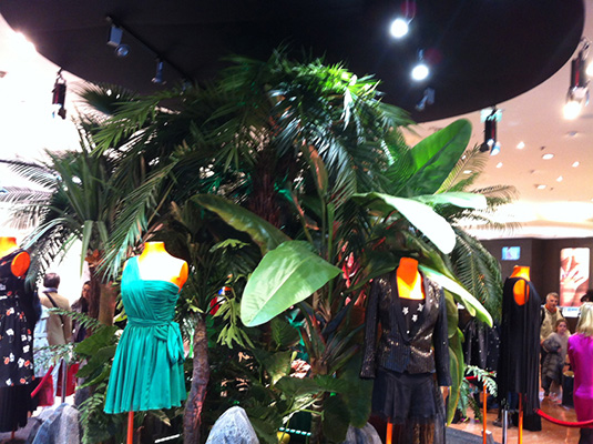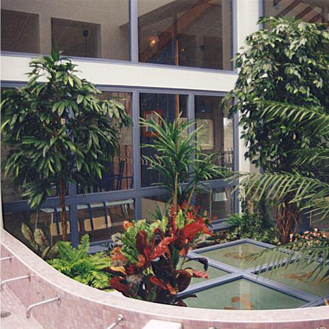 Composition de plantes artificielles pour donner une ambiance exotique à ce hall.